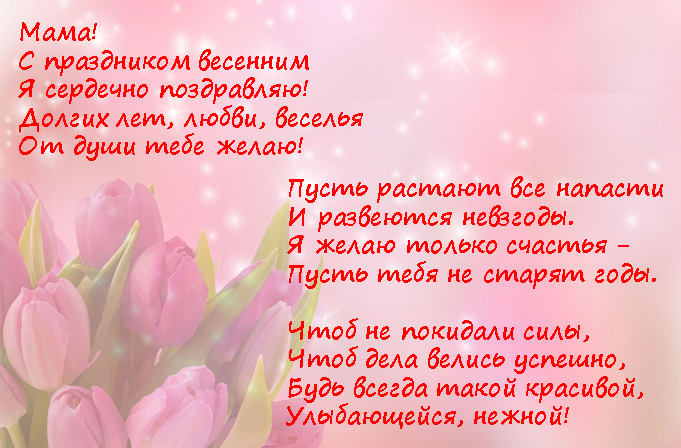 Еще один праздник, который широко отмечается, это, конечно, 8 марта. Стихи можно прочитать на любом мероприятии, посвященном этому дню.