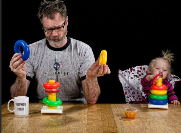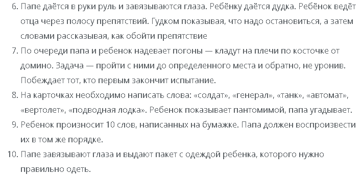 7. Если на празднике несколько детей, можно провести  этот конкурс. Каждому представителю мужского пола завязывают глаза и дают пакет с детской одеждой. Задача — одеть правильно детей на время.