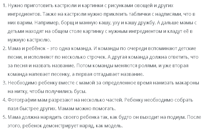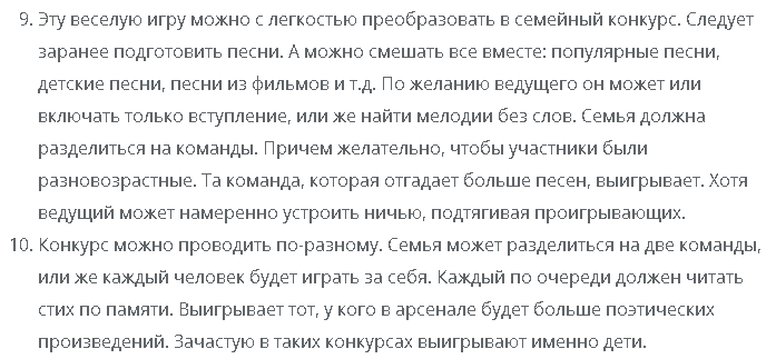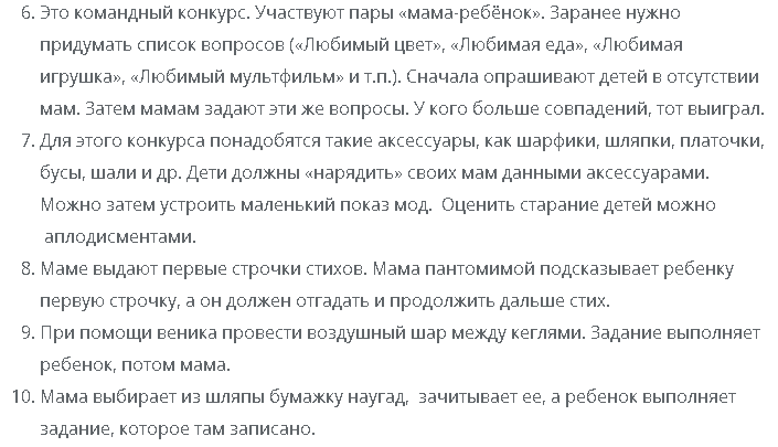 5. Все присутствующие женщины должны вспомнить и напеть колыбельную песню. Выигрывает та, кто больше всех вспомнит таких песен, не повторяя предыдущие.
