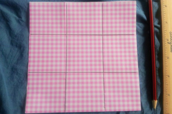 Чтобы изготовить эту корзинку, нужна бумага квадратной формы. Если у вас лист прямоугольный, согните его по диагонали и отрежьте лишнее. Отрезанная полоска пригодится для ручки. Стороны квадрата должны делиться на 3. Листы накладываем друг надруга и делим на 9 частей (равных), как на схеме, для этого нужно провести параллельные линии по вертикали и горизонтали.