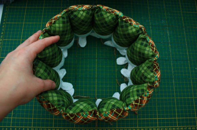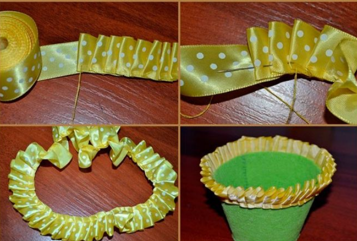 Ленту сборим и шьем по краю, чтобы зафиксировать сборки. Приклеиваем.