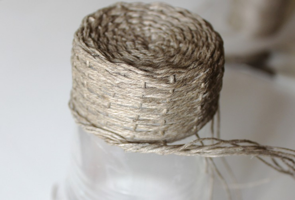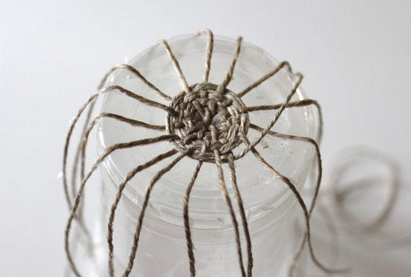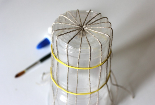 Протыкаем дно, используя спицу или шило, вставляем шпагат. Распределяем его по стакану и закрепляем резинками.