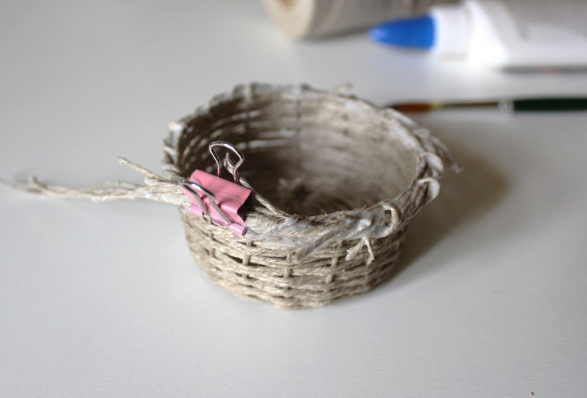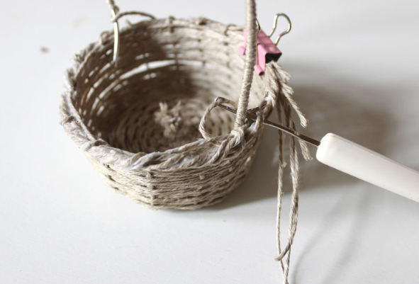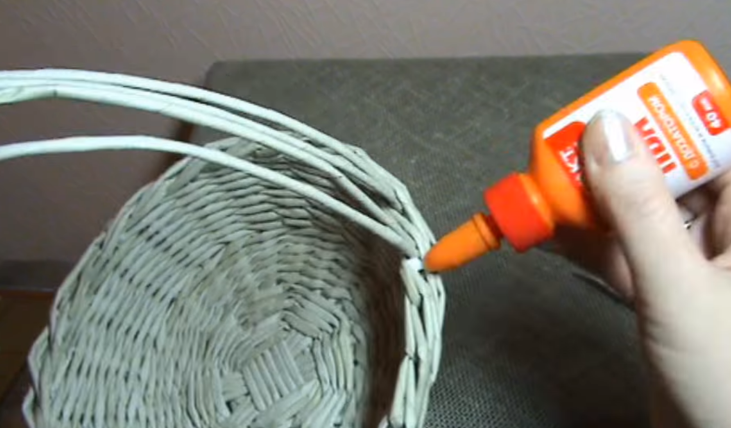 Соединяем ручку с корзиной, можно привязать ее, используя крючок. Промазываем клеем.