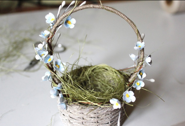 Украсить корзинку по своему вкусу. Можно положить сизаль, ручку украсить цветами. Положить яйца.