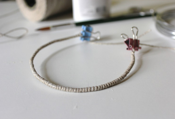 Итак, сделали основу для корзинки. Далее разводим клей с водой, промазываем и отставляем в сторону. Делаем ручку. Кусок проволоки отрезаем — 30 см, обматываем шпагатом. Закрепляем зажимом кончики и промазываем клеем.