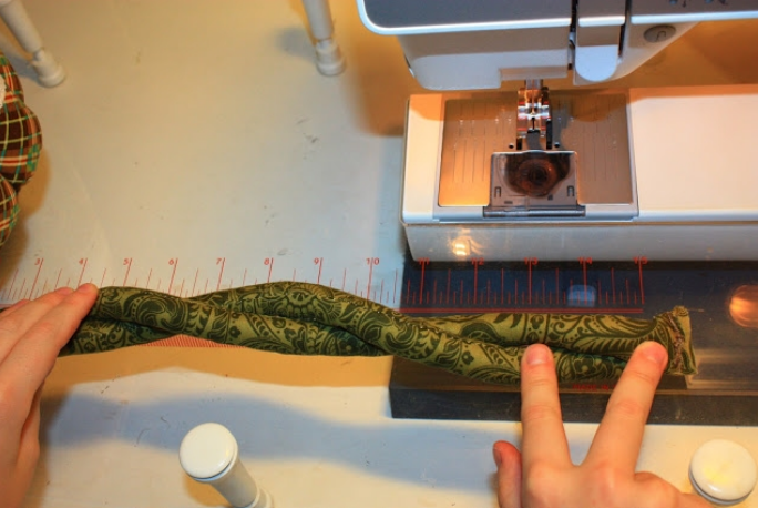 Приступаем к изготовлению ручек. Вырезаем две полоски — 6Х50 см, сшиваем и выворачиваем. Набиваем синтепоном.