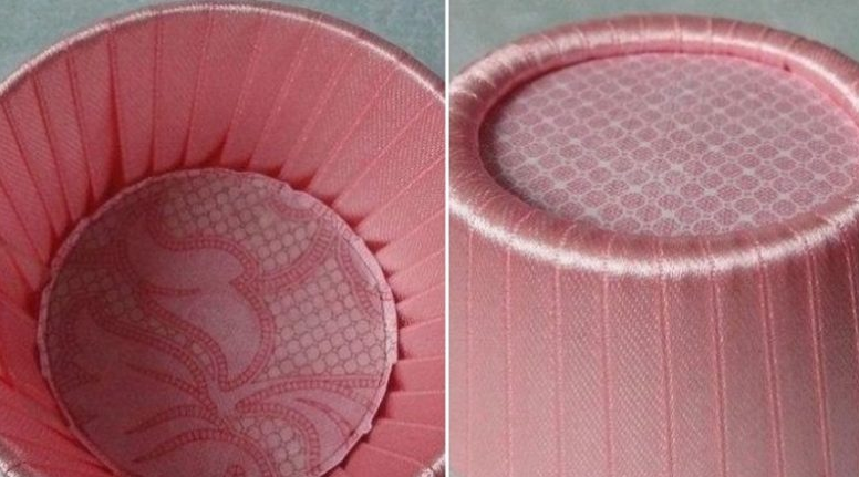 Дно будущей корзинки оклеить кружком, вырезанным из картона. Наклеить ткань в тон ленты.
