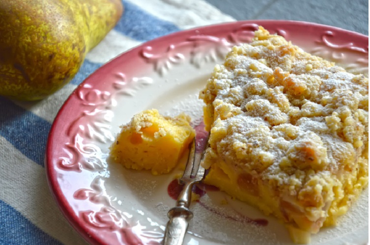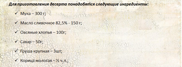 Груша по плотности и текстуре идентична яблоку. Имеет схожую технологию приготовления. Овсяные хлопья придают десерту невесомости, воздушности.