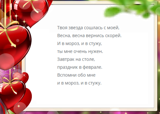 Ты моя сила и моя жизнь. Нет никого во всем мире, кто смог бы когда-нибудь заменить тебя. Жду с нетерпением встречи! Пусть сегодня все звезды мира сияют лишь для тебя, сердце переполняется чувствами ко мне, а в душе навсегда исчезнет февральская стужа!
