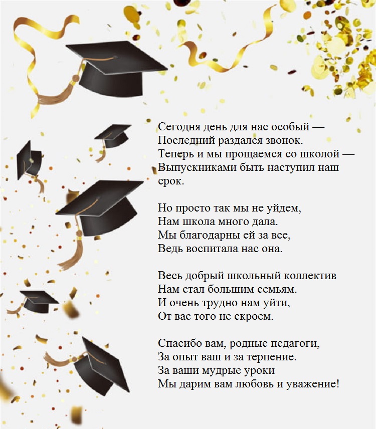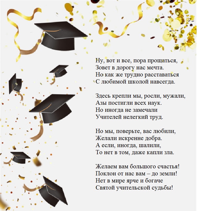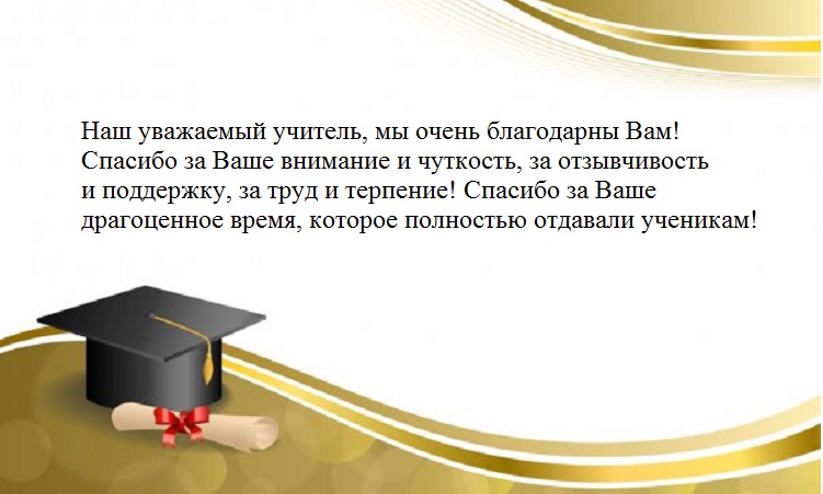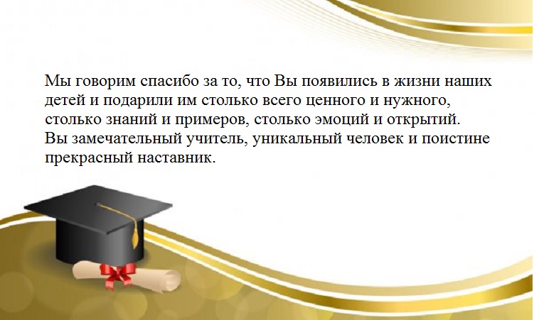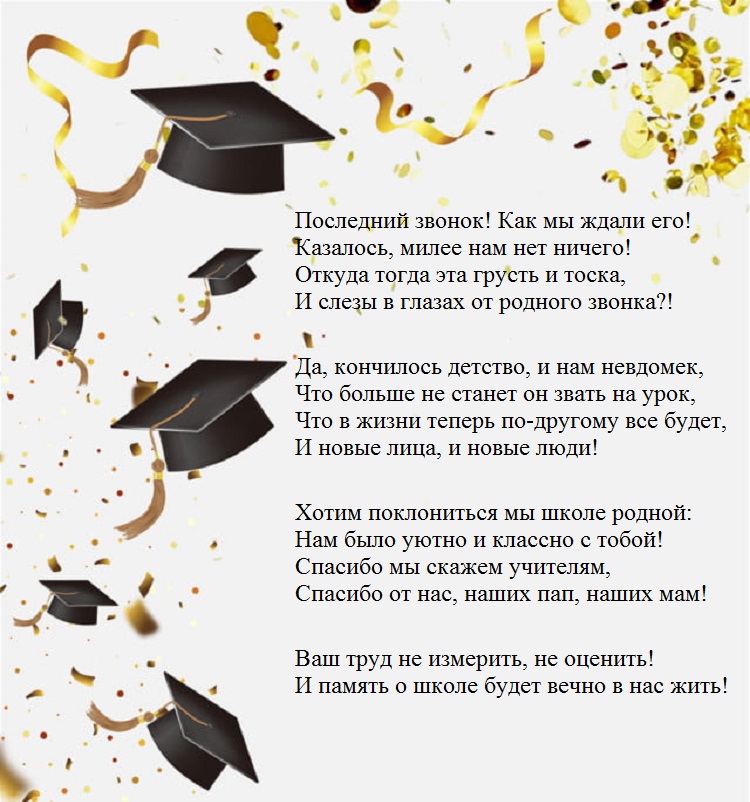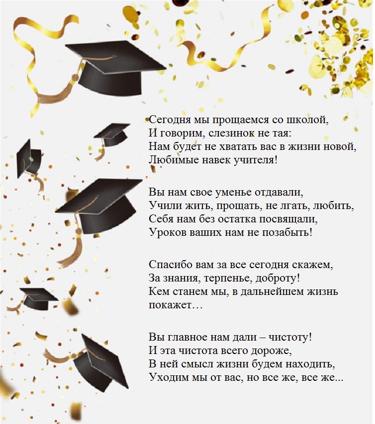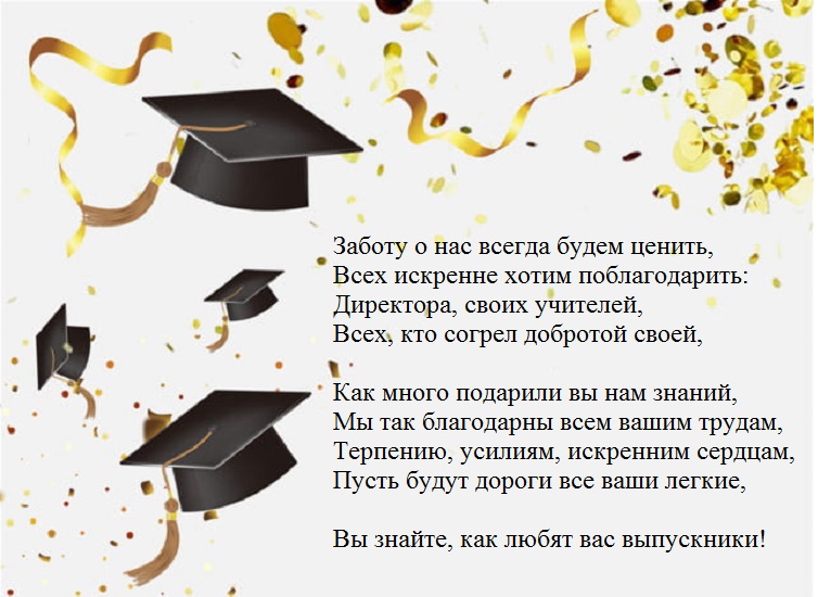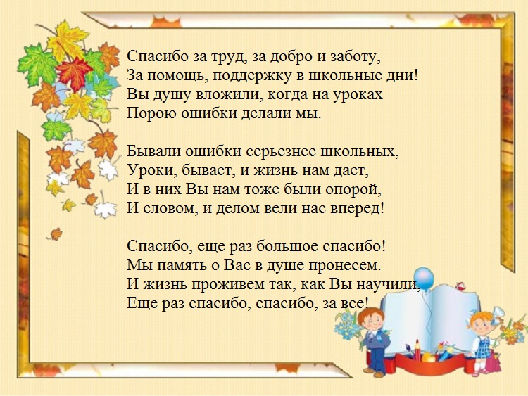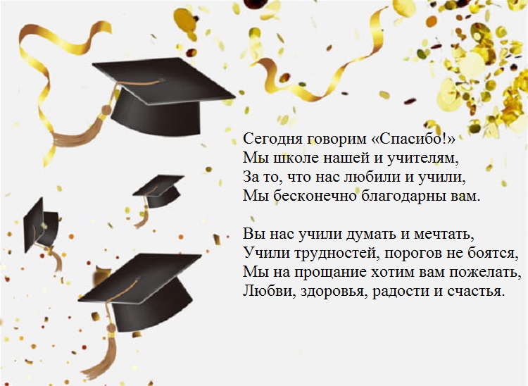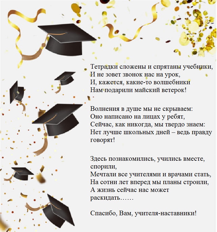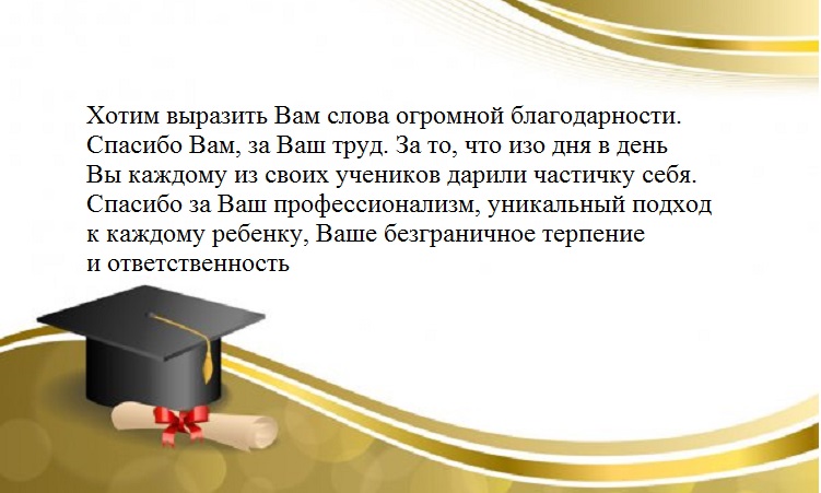 PS: Слова благодарности выразить могут как ученики, так и родители. Благодарственная речь может быть озвучена от всего класса. Если же у вас по сценарию времени достаточно, тогда слова благодарности школе и учителям могут выразить все ученики класса по отдельности, небольшими стихотворениями.