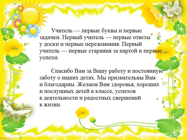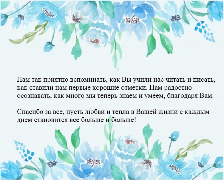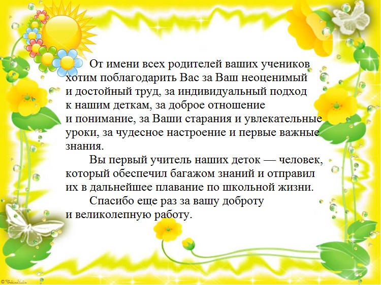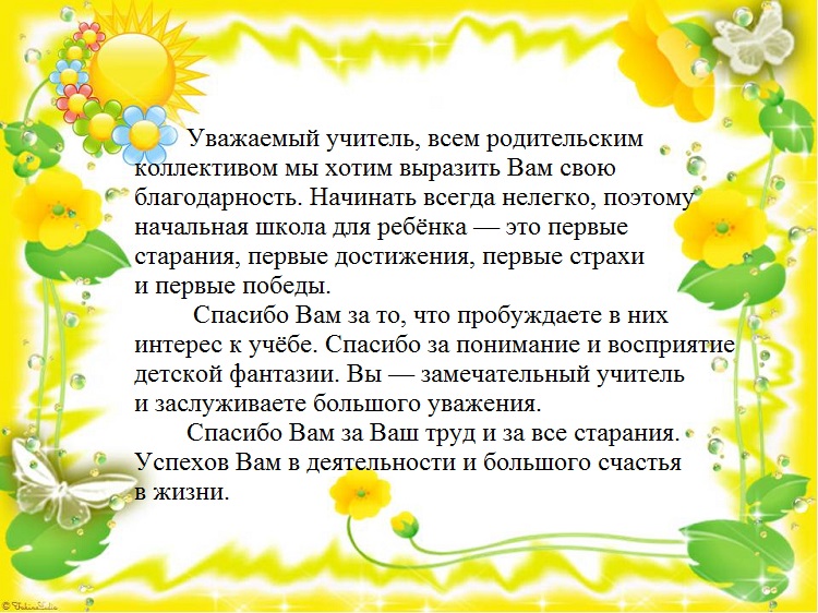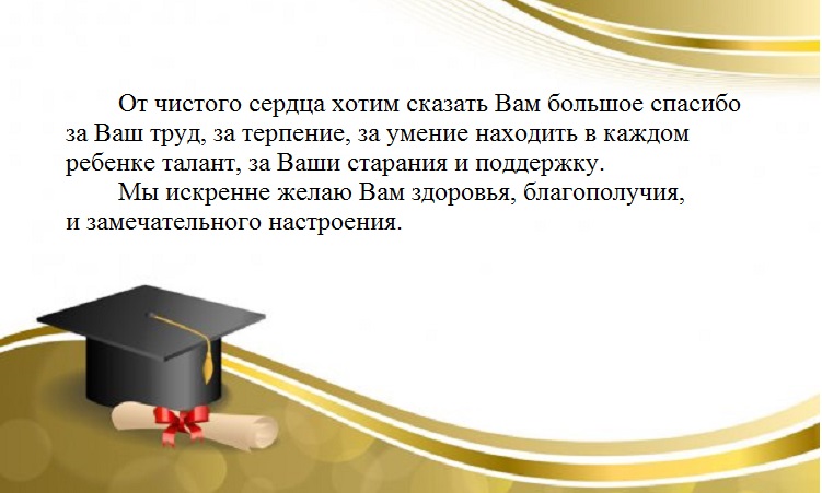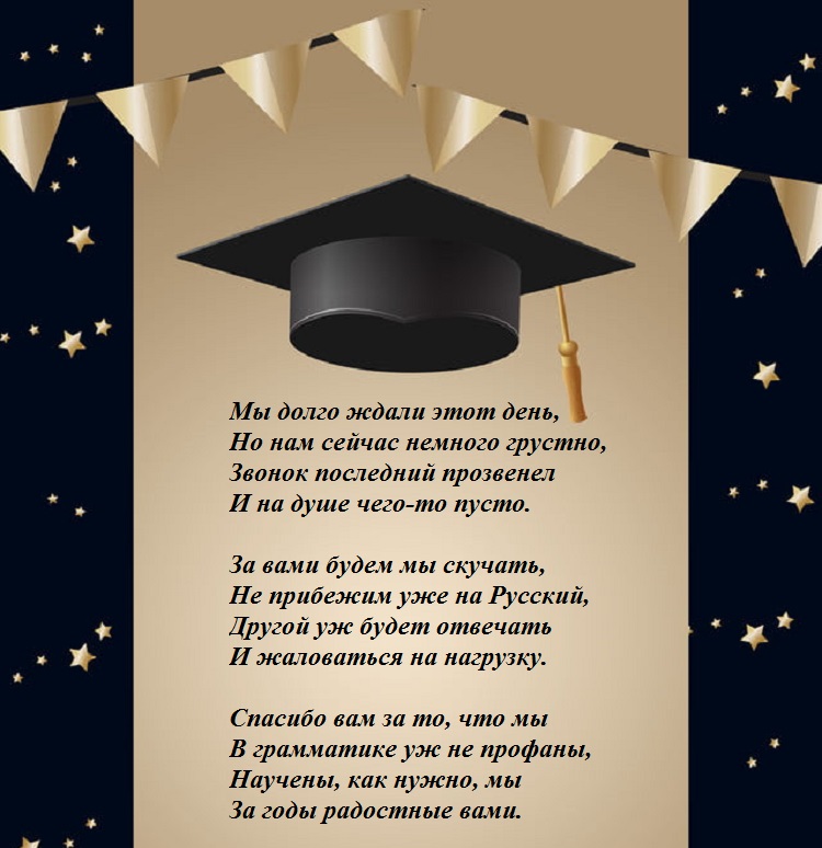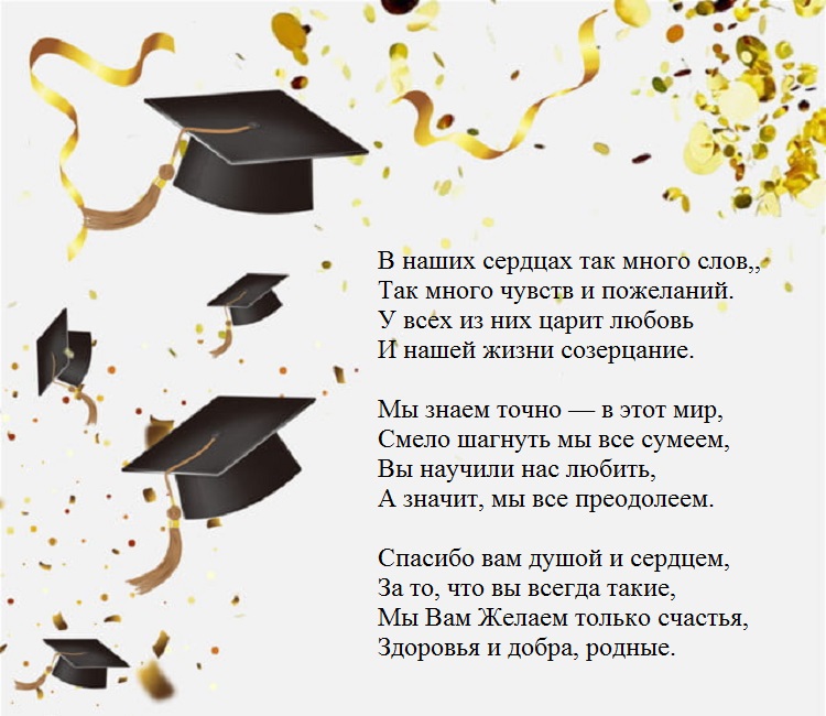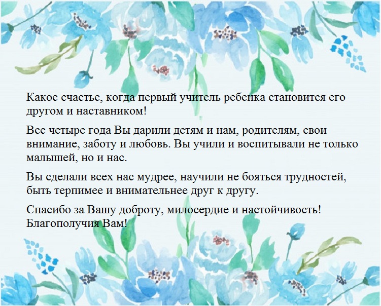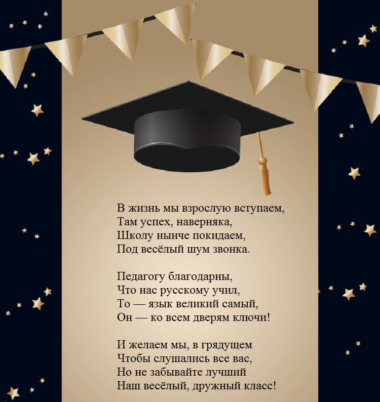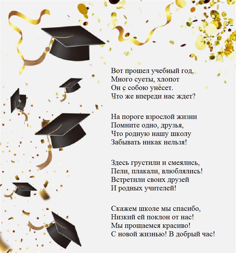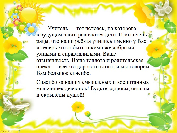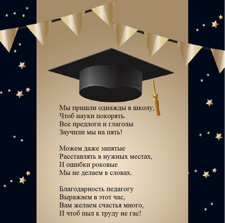 PS: Слова благодарности выразить могут как ученики, так и родители. Благодарственная речь может быть озвучена от всего класса. Если же у вас по сценарию времени достаточно, тогда слова благодарности школе и учителям могут выразить все ученики класса по отдельности, небольшими стихотворениями.