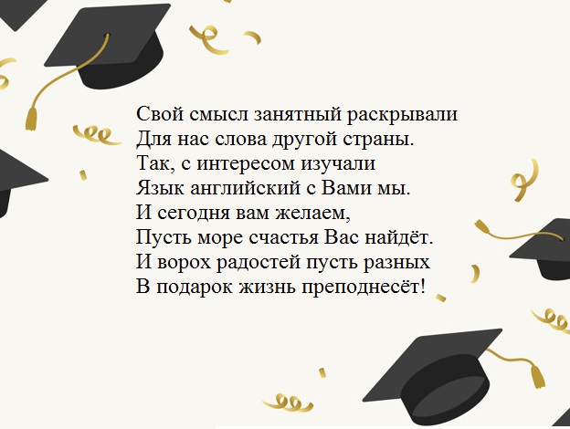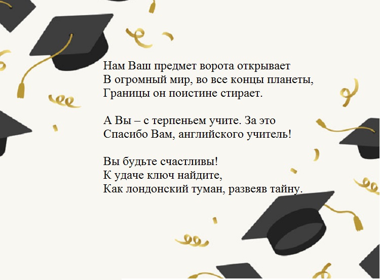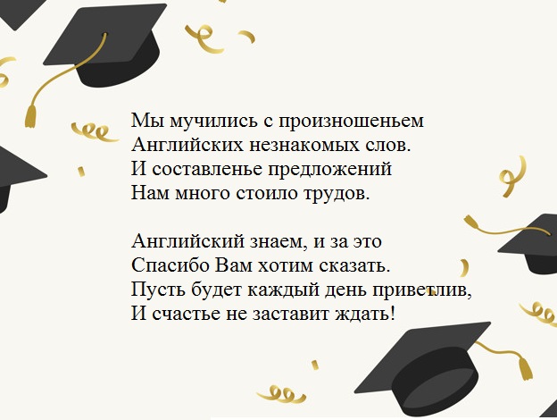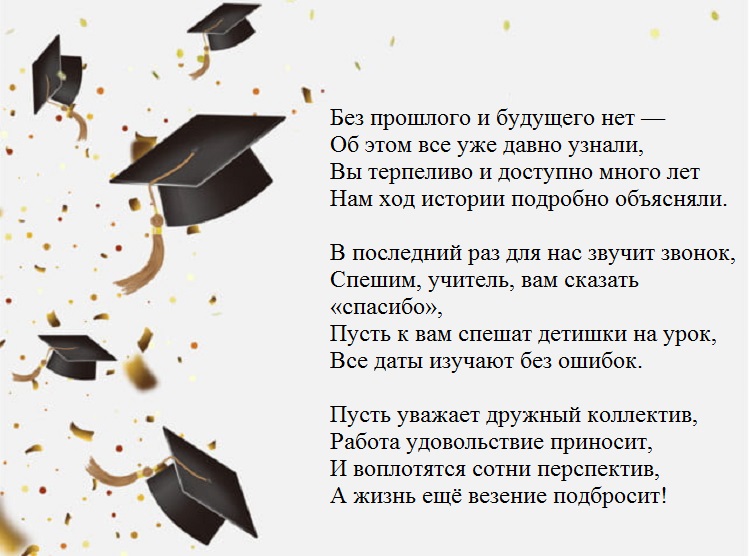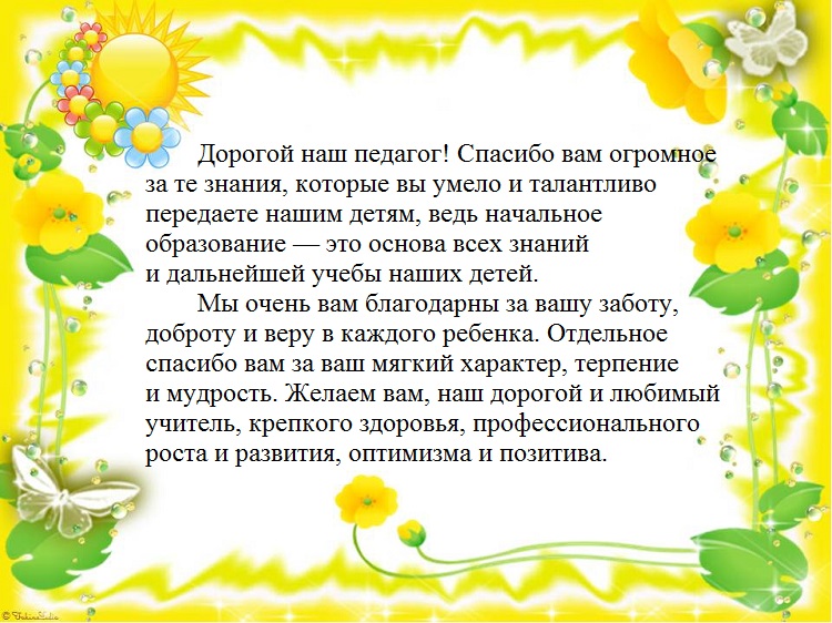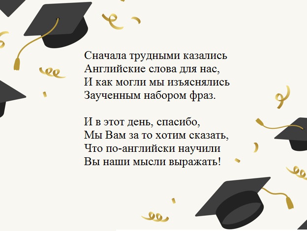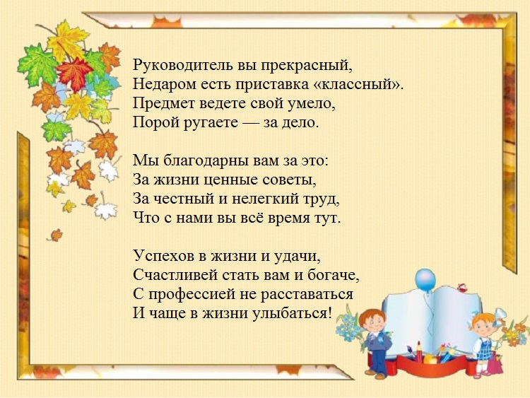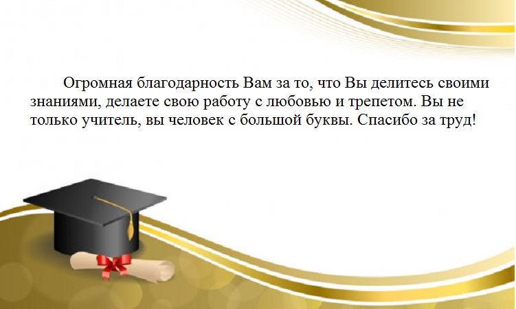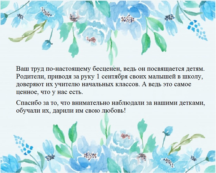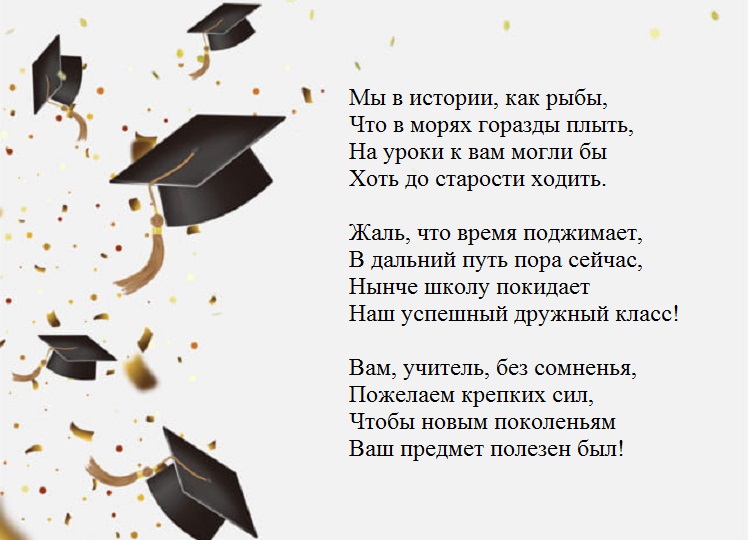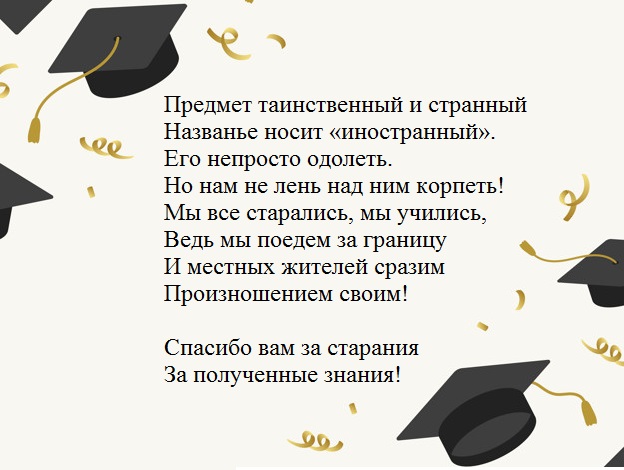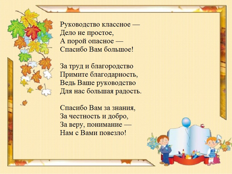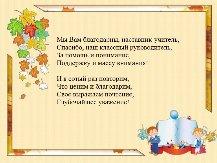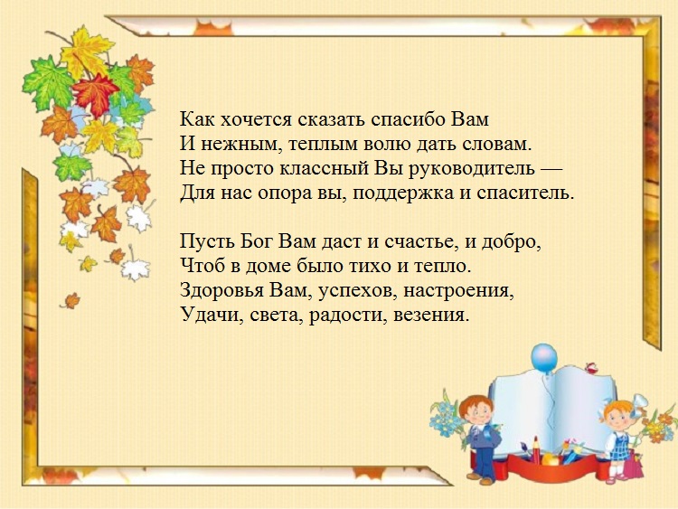 PS: Слова благодарности выразить могут как ученики, так и родители. Благодарственная речь может быть озвучена от всего класса. Если же у вас по сценарию времени достаточно, тогда слова благодарности школе и учителям могут выразить все ученики класса по отдельности, небольшими стихотворениями.