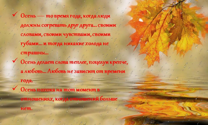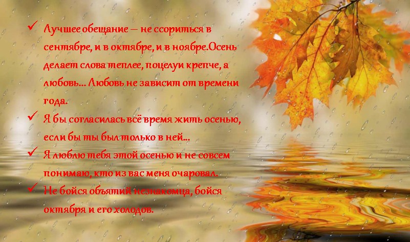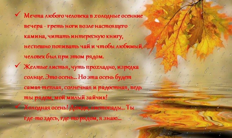 Осень для многих ассоциируется с печальной и грустной порой. Именно в эти дни так хочется, чтобы тебя кто-то согрел своей любовью. Расскажите об этом вашим друзьям на своей страничке.