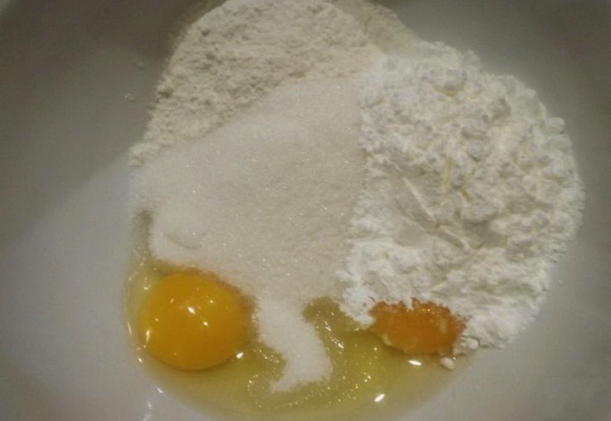 Соединить кукурузный крахмал, муку, сахар-песок, ванильный сахар, яйца.