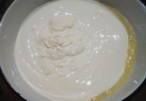 Ингредиенты: яйца, сахар и сметана смешиваются миксером.
