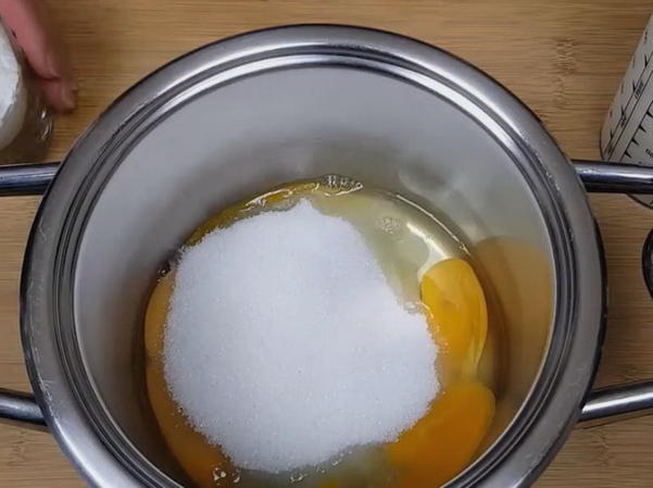 В небольшую кастрюлю разбейте яйца и добавьте к ним сахар.