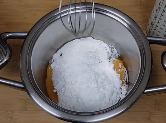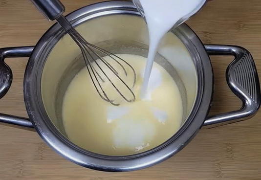 Теперь делаем крем, для этого нужно соединить яичные желтки с кукурузным крахмалом, ванильным сахаром и солью. Завариваем на небольшом огне.