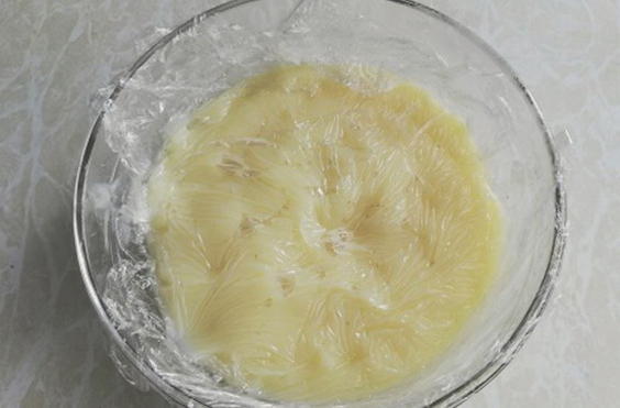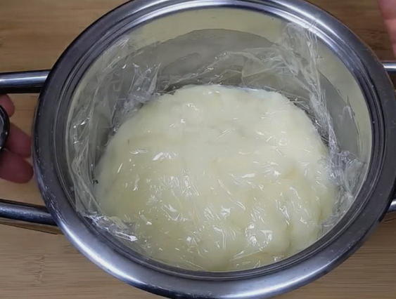 Подготовьте охлажденную в холодильнике миску и переложите крем в нее, сверху накройте целлофаном до соприкосновения с кремом — это нужно для того, чтобы не образовалась на креме пленка. Затем, дайте крему остыть.