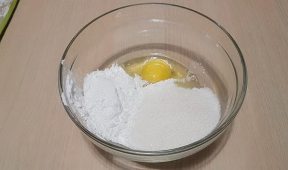 Возьмите миску и взбейте вместе с яйцом сахар и крахмал.