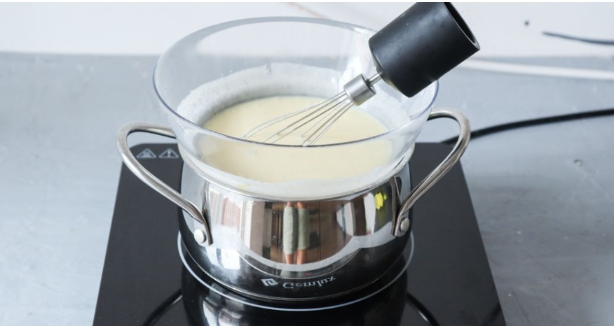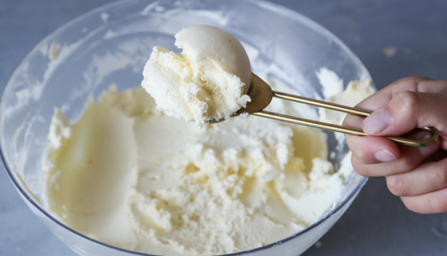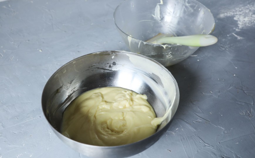 Горячая заварная основа для крема соединяется с маслом, после чего охлаждается.