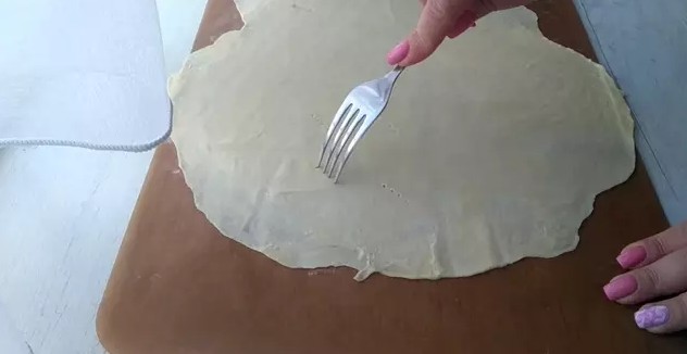 По истечении времени, каждую часть раскатать и наколоть вилкой или другим подходящим инструментом. Выпекать до золотистого цвета при t 210 градусов.