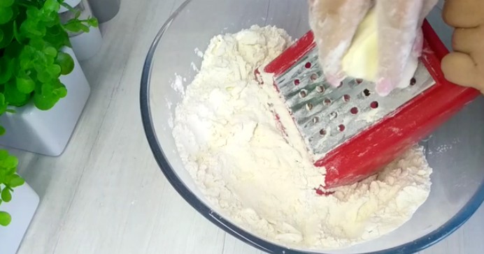 Сначала делается крошка, для этого нужно твердое масло натереть на терке и объединить его с мукой.
