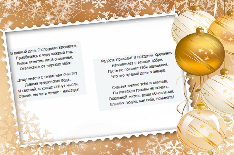 День очень важен для православия. Люди поздравляют друг друга и словесно и в открытках, пишут поздравительные смс. Этому празднику посвящено очень много стихов. Их пишут и в прозе, и в рифме. Они прекрасны, легко запоминаются, и передают незабываемую ауру крещенского праздника.