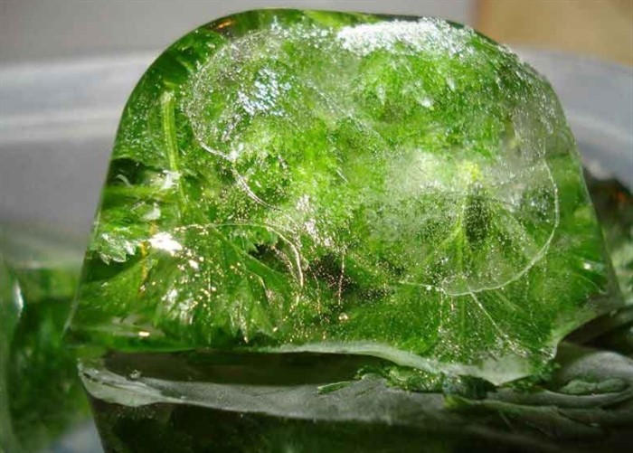 Свежую петрушку пропустите через мясорубку. Сок отожмите, заморозьте. Ледовые кубики из сока петрушки снимают отечность, обладают отбеливающими качествами, помогает бороться с морщинами.