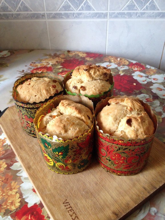 Тесто сразу же раскладываем по формам, формы заранее промасливаем и посыпаем мукой. Ставим в печь (200ºC), печем до готовности. Готовый кулич поливаем глазурью, шоколадом или сахарной пудрой.