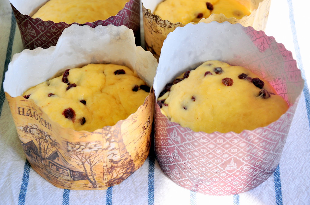 Для этого теста лучше брать бумажные формочки. Они долго сохраняют товарный вид кулича. Заранее обмазываем внутреннюю поверхность бумаги сливочным маслом. Чтобы сократить расход этого дорогого продукта, лучше растопить треть пачки масла и промаслить кисточкой края форм. Заполняем бумажный кулек на треть, в процессе приготовления куличи подойдут и займут оставшееся пространство.