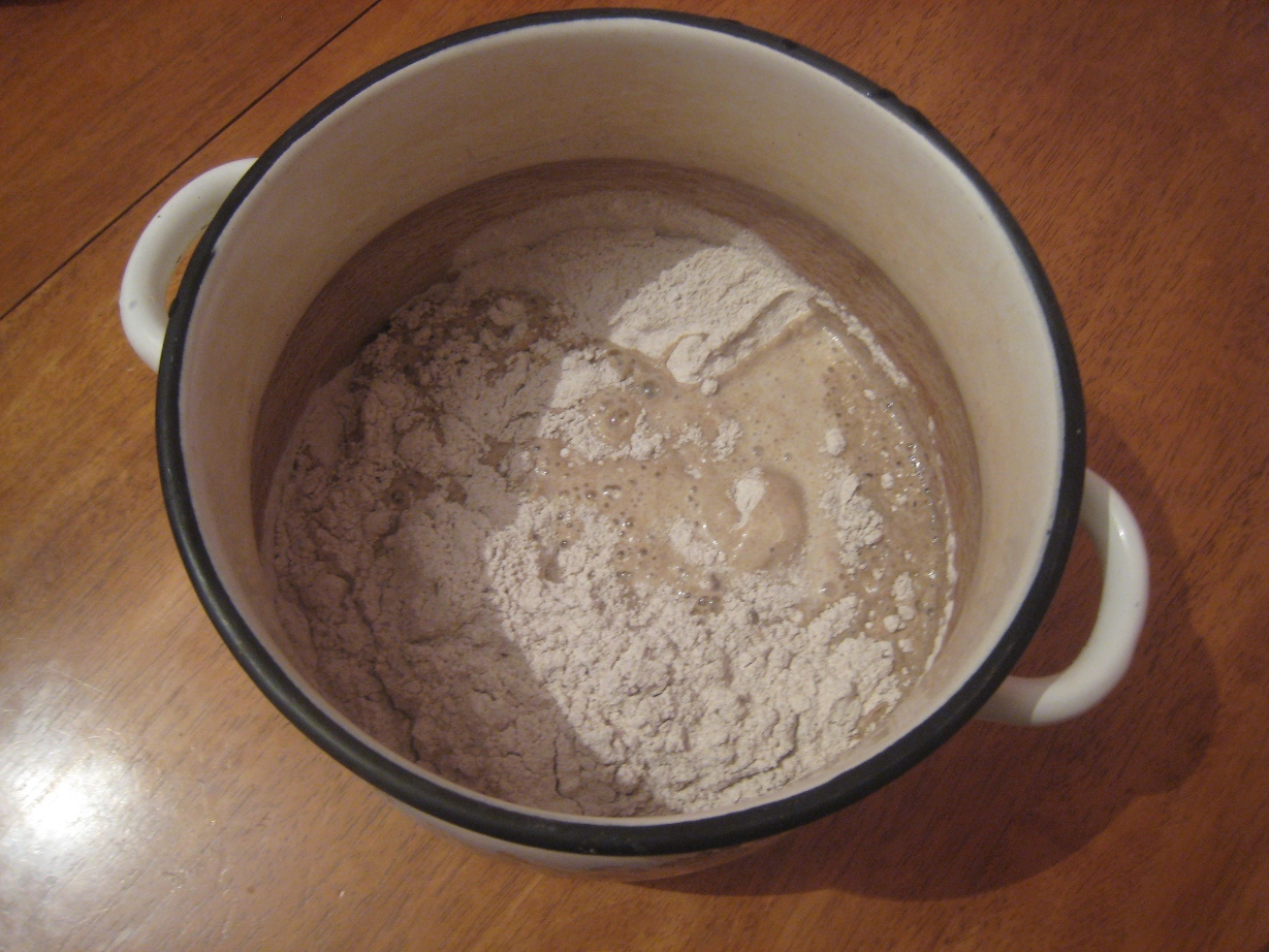 Первым делом разводим опару: молоко+мягкие дрожжи+3 ст.л. сахара+300 г муки (просеянной 2 раза). Просеивание на этом этапе очень важно, если хочется сэкономить на этом время, лучше отложить это занятие для другого вида выпечки.