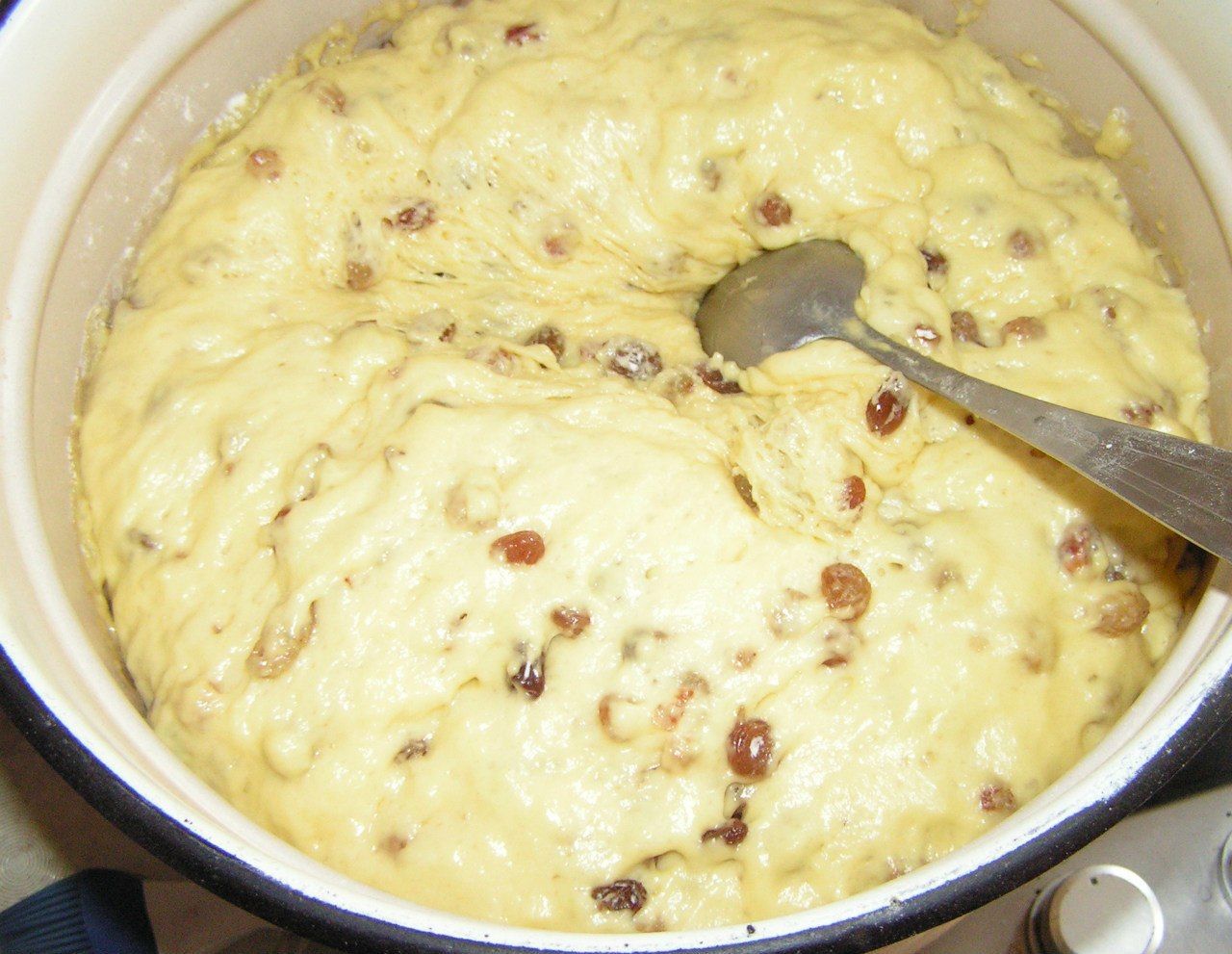 После поднятия теста в него всыпается изюм, тертая цедра, добавляется порция просеянной муки и снова будущий кулич отправляется для подхода в теплый свободный угол. Когда тесто начнет подниматься, осаживаем его и раскладываем по подготовленным формам. В подготовку входит промасливание бортиков. В старину и смазывали сливочным маслом и обсыпали дробленой пшеницей, манкой. Так тесто будет легко извлекаться после выпечки.