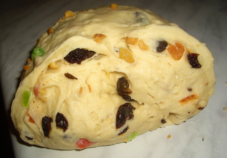 Пришла очередь сухофруктов и цукатов. Раскатываем тесто по столу, сверху распределяем цукаты на одинаковом расстоянии друг от друга, сухофрукты тоже. Теперь скатываем тесто и продолжаем вымешивать, так тесто получит равномерную начинку. Загружаем готовое тесто в глубокую емкость и оставляем подходить. Когда масса увеличится, извлекаем тесто по порциям и раскладываем в формы.