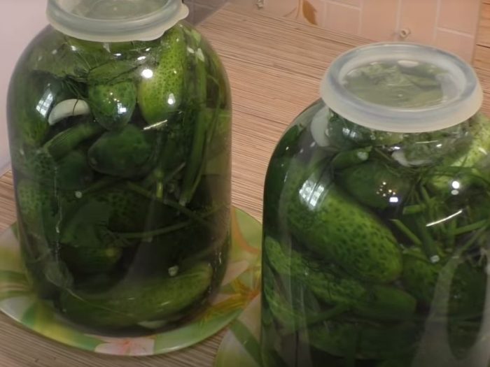 - Огурцы покрывают прохладной водой хорошего качества (родниковой, колодезной или отфильтрованной), закрывают плотными пластиковыми крышками. Банки слегка взбалтывают, чтобы соль растворилась и выставляют в прохладное место.