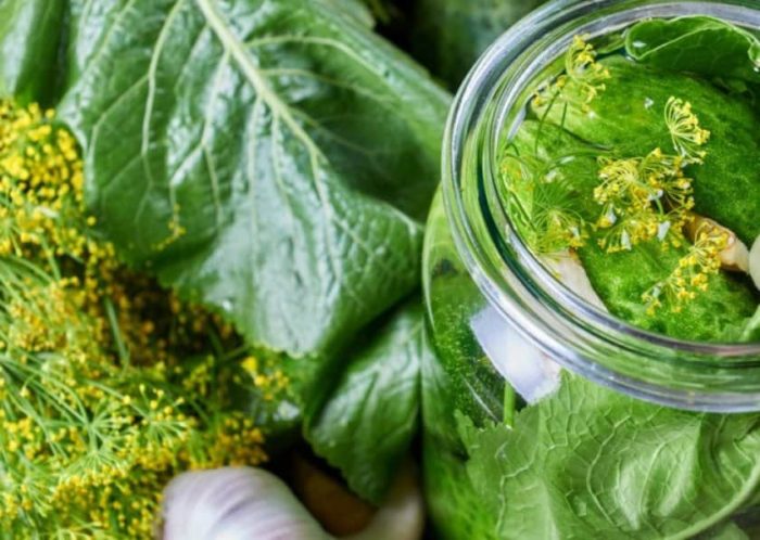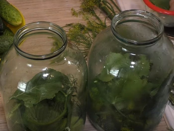 - Емкости заполняют плотно зеленцами и сверху укладывают оставшиеся листья и чеснок.