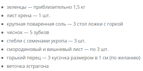 - На дно банки выкладывают стебли укропа и порезанный черешок хрена. Банку заполняют зеленцами до «плечиков», добавляя кусочки горького перца, чеснок, укропные зонтики, эстрагон и ароматные листочки вишни и смородины.
