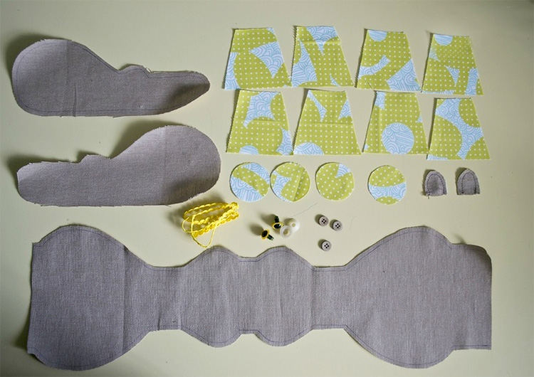 Приготовьте ткань (две расцветки), бусины для глаз, наполнитель, пуговицы — 3 штуки, тесемку.