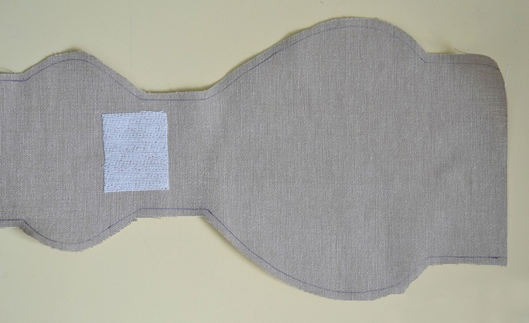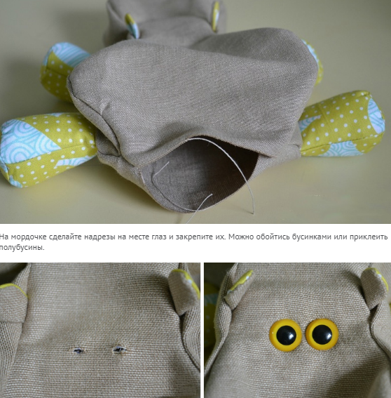 Если у вас ткань мягкая, на место глаз с изнанки нашиваем кусок флизелина.