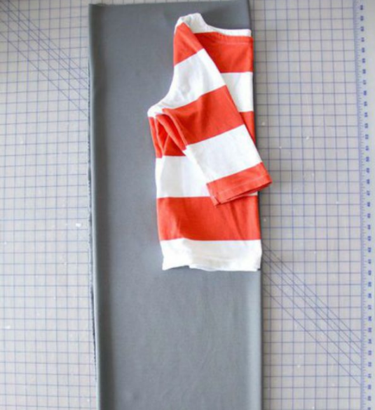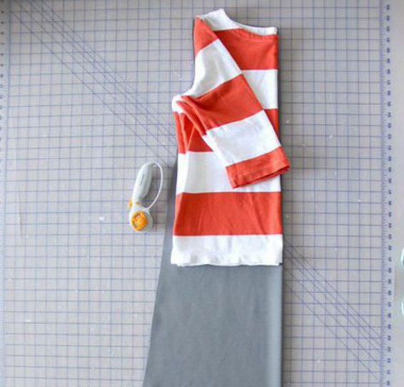 Первым делом, необходимо ткань прогладить утюгом. Складываем вашу ткань по ните долевой, а сверху накладываем футболку и обводим ее мелом. Отмерьте необходимую длину, учитывая несколько сантиметров для подгиба. По бокам прибавьте пару сантиметров.