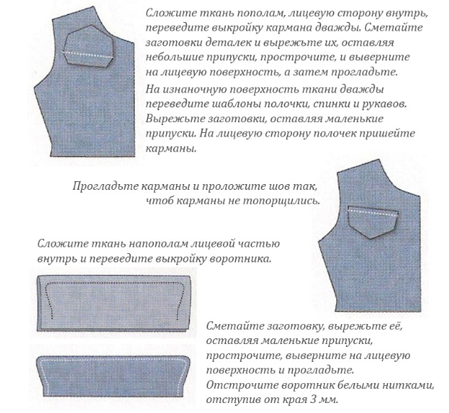 Для этой модели подойдет воротник-стойка, который можно вырезать не используя выкройку — полоска из ткани, которая равна длине горловины.