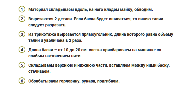 Раскладываем ткань на ровной поверхности и откладываем на ней полученные размеры, затем вырезаем (припуски на швы — 1,5 сантиметра). Сметываем боковые швы и прострачиваем не до конца ( чтобы можно было вставить резинку). Верхнюю часть подворачиваем на один сантиметр. + ширина резинки. Строчим на машинке первый сгиб (получается кулиска) и вставляем резинку. Теперь сшиваем боковые швы и подшиваем.