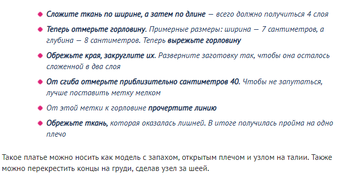 Проще простого сшить платье на вечеринку, в театр, на свадьбу. На его пошив, у вас уйдет не более двух часов. Купите два отреза ткани разных цветов, сочетающиеся по цвету. Длину рассчитайте, исходя из длины платья, умноженное на два. Допустим, ваша длина — 1, 10 метр, умножаем на два и получаем 2 метра 20 сантиметров — столько понадобиться каждого отреза ткани. Рассчитываем ширину — длину плеча умножаем на 2, 5. Перекидываем каждую часть через плечо, края ткани должны быть на одинаковом уровне. Края прострочите, оставляя длину пройм и горловины. Украсьте красивым поясом.