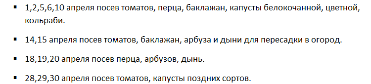 В период роста с 1 по 7 апреля, с 24 по 30 апреля самые благоприятные дни для посева, пикировки, прикорневой обработки. На полнолуние 8 апреля лучше не проводить никаких мероприятий с семенами.