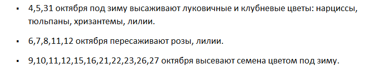 В октябре еще можно посеять цветы, пересадить розы. Пионы лучше спрятать в теплом подвале до весны, они довольно тяжело переносят зимние морозы. Октябрь месяц тюльпанов, их высаживают в ящики и закладывают на охлаждение перед вегетацией.