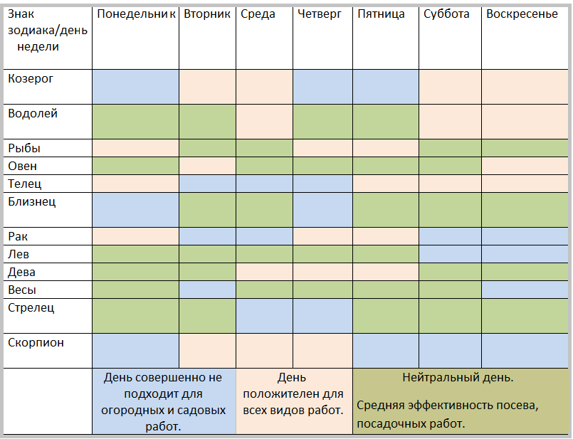 Не все дни недели подходят для посева, пикировка, посадки саженцев. Такие же правила и для проведения огородных работ, прополки, рыхления, внесения подкормок. Все семь дней недели тесно взаимосвязаны со знаками. Влияние которых описано выше.