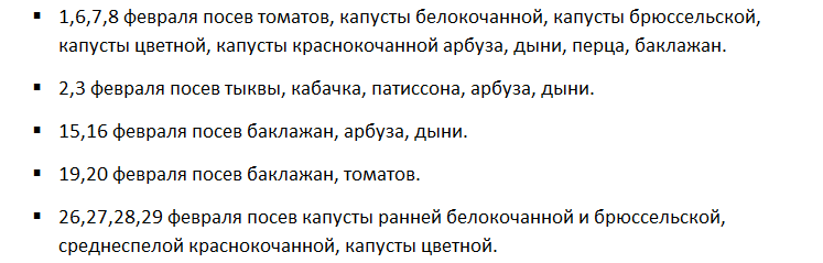 В период роста с 1 по 8 февраля, с 24 по 29 февраля самые благоприятные дни для посева, пикировки, прикорневой обработки. На полнолуние 9 февраля лучше не проводить никаких мероприятий с семенами. Высевают семена с учетом дальнейшей перевалки пикированной рассады в обогреваемые теплицы.