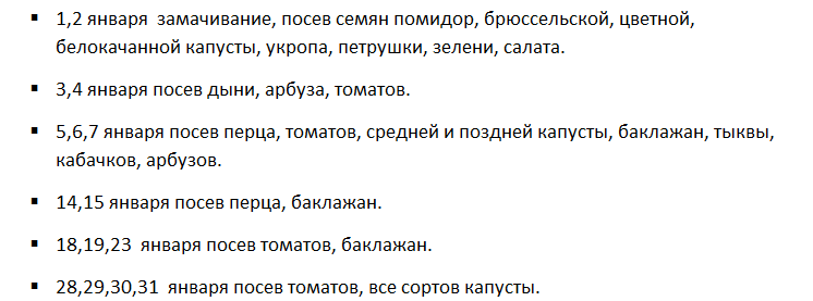 В период роста с 1 по 9 января, с 26 по 29 января, самые благоприятные дни для посева, пикировки, прикорневой обработки. На полнолуние 20 января лучше не проводить никаких мероприятий с семенами. Посев семенного материала на рассаду проводится для обогреваемых и хорошо освещаемых теплиц.