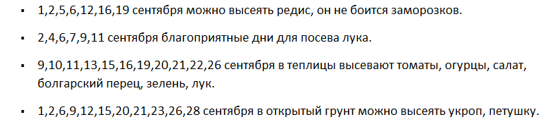 В сентябре обычно заканчивают уборку урожая. Высеять можно зелень, лук. В основном, посев либо посадку рассады проводят в теплые теплицы.