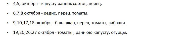 Октябрь довольно холодный месяц, поэтому посев на огороде возможен только зелени. Основная посадка ранних культур проводится в отапливаемых теплицах. 16 октября новолуние, никаких работ с землей не проводят. На полнолуние 2,31 октября можно сеять и садить.