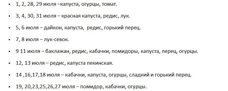 В июле, как правило, высаживают те культуры, что поздно высеяли на рассаду. Желательно, чтобы это были ранние, скороспелые сорта, с коротким периодом вегетации. Иначе период созревания выпадет на конец августа, когда начинается похолодание. Более поздние сорта могут быть высажены при условии крытых грядок, переносных парников.